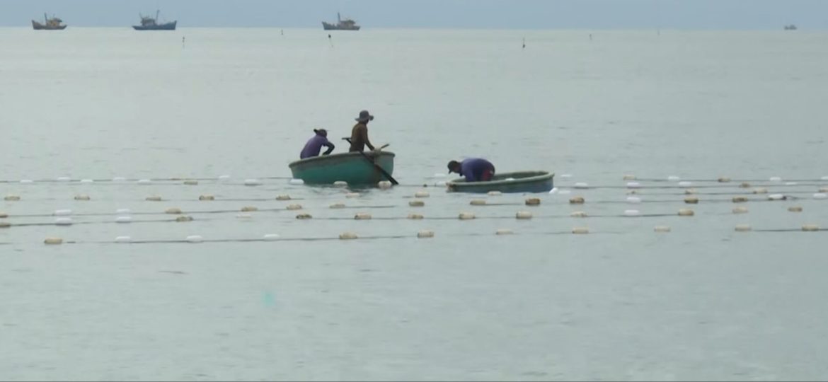 Với chiều dài khoảng 5 km dọc theo bờ, phao xốp nổi lềnh bềnh, phía dưới gắn đùm lưới. Những con tôm hùm con bằng cọng tăm chui vào đùm ẩn nấp, ăn sinh vật phù du để lớn. Mỗi sáng, những ngư dân chèo thúng ra biển, tháo đùm khỏi sợi dây chung rồi giũ nhẹ, bắt tôm con rơi ra, nuôi trong thùng xốp chứa nước biển, có chạy khí oxy để bán làm tôm giống.